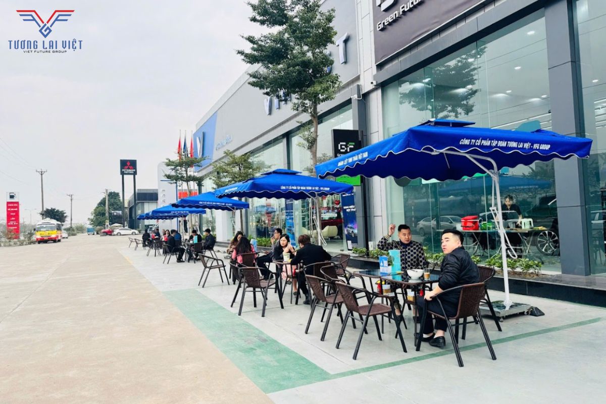 Tinh thần Việt trong sự kiện ăn sáng – cà phê tại VFG được thể hiện qua không gian và cách tổ chức tại showroom. Khu vực ăn sáng được bố trí ngay phía trước showroom với bàn ghế gọn gàng tạo cảm giác quen thuộc như một quán cà phê buổi sáng. Khách hàng có thể ngồi lại dùng bữa, trò chuyện trong không khí thoáng đãng, đồng thời quan sát không gian trưng bày xe phía bên trong. Trong quá trình diễn ra sự kiện, các hoạt động phục vụ và tư vấn được sắp xếp tách bạch, giúp khách hàng chủ động tìm hiểu thông tin khi có nhu cầu.